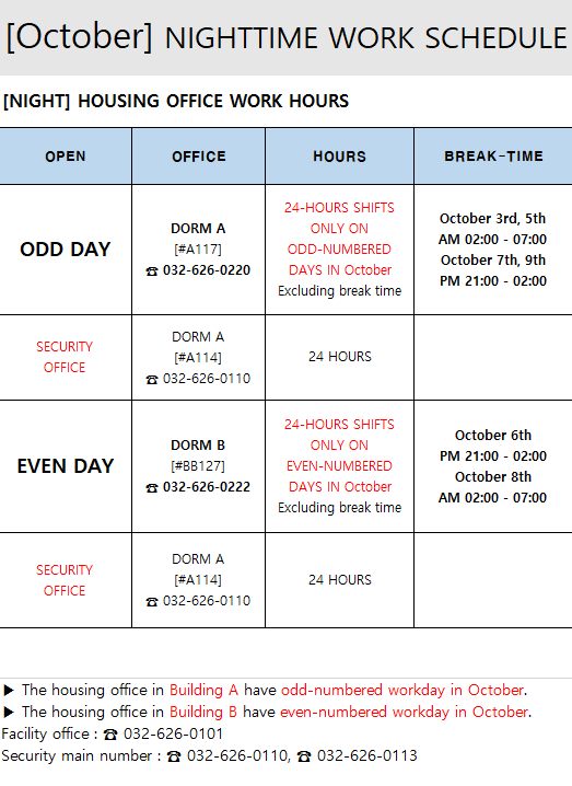 [NOTICE] Nighttime housing staff Work Schedule in October