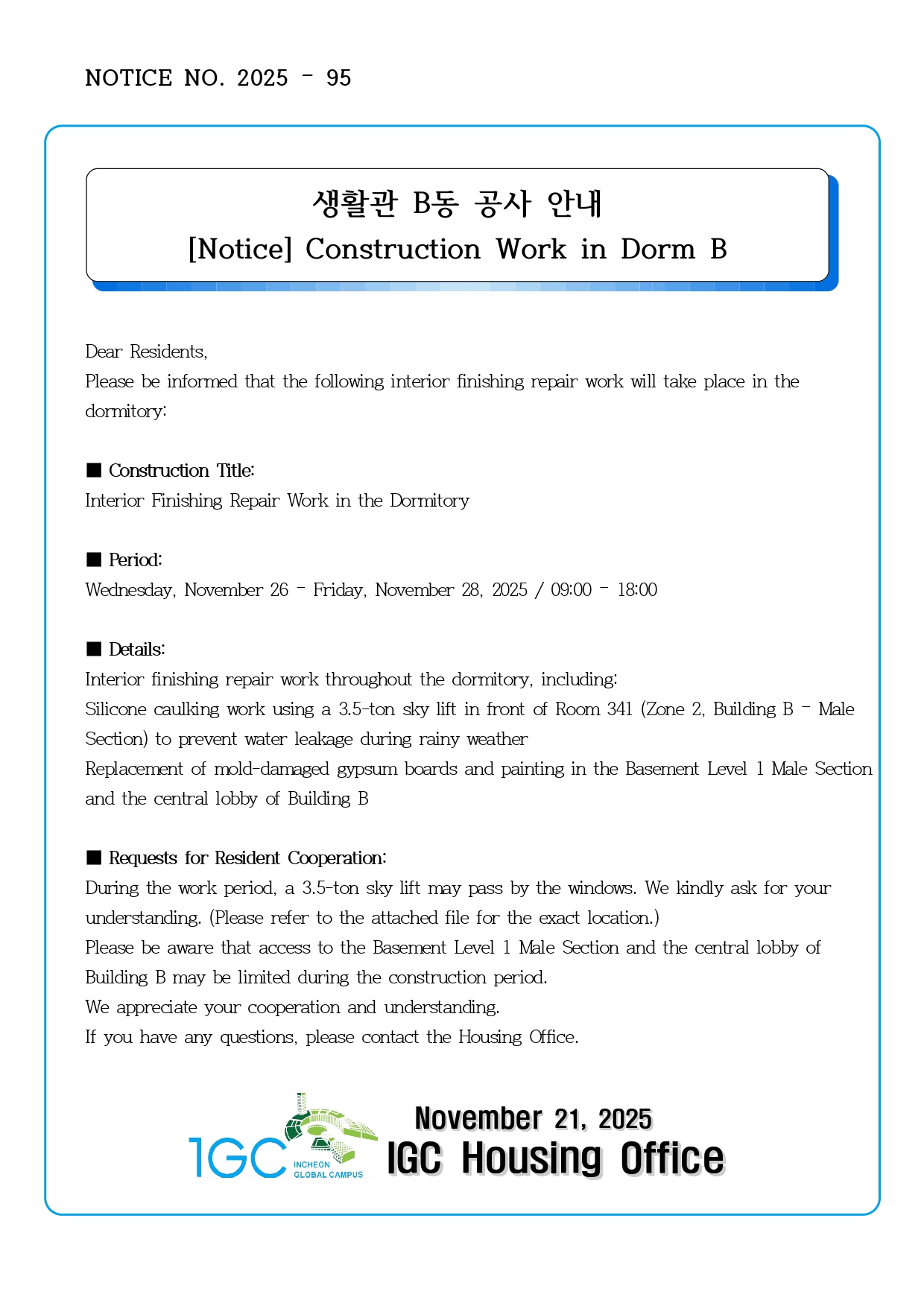 [Notice] Construction Work in Dorm B(11/26~11/28)