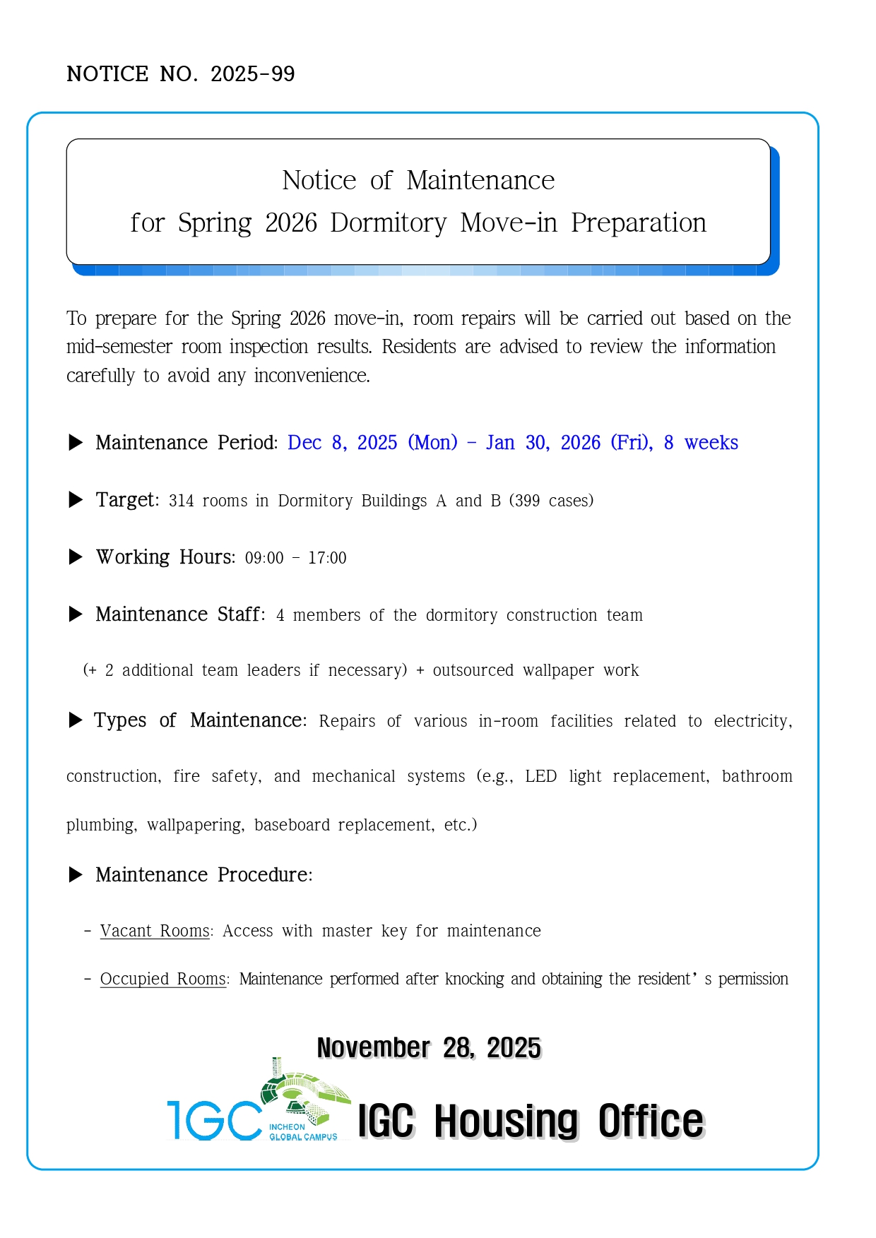 Notice of Maintenance for Spring 2026 Dormitory Move-in Preparation