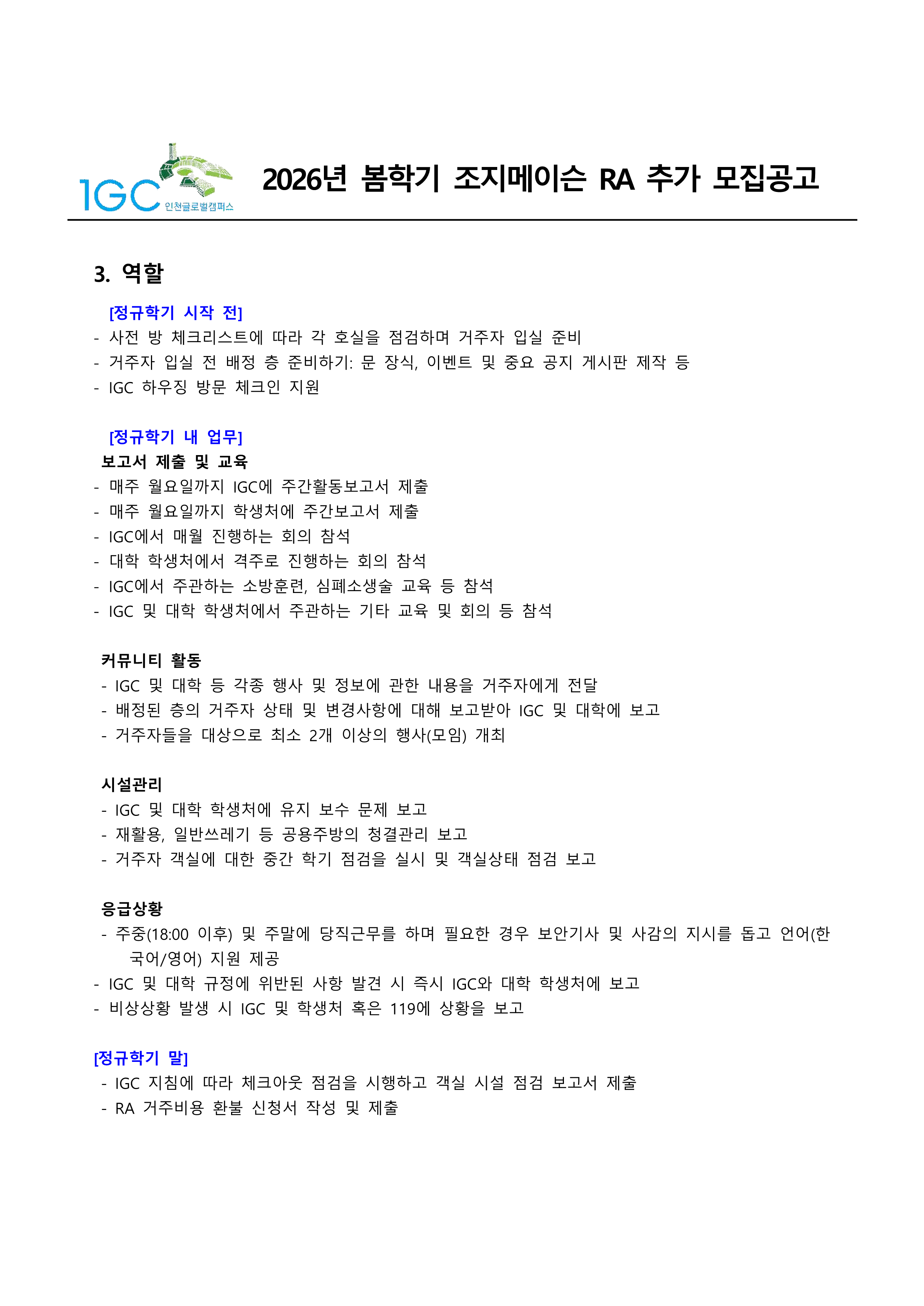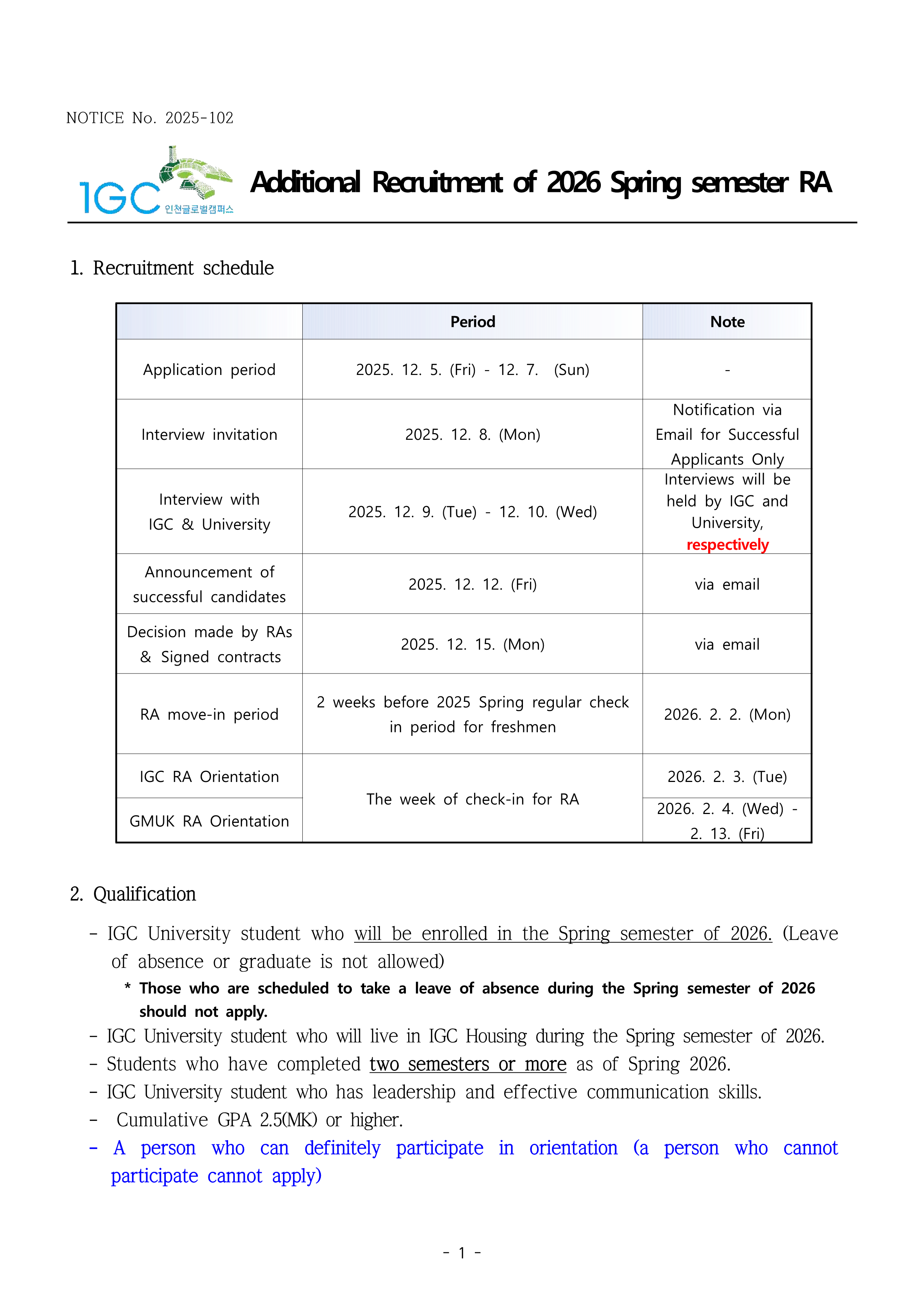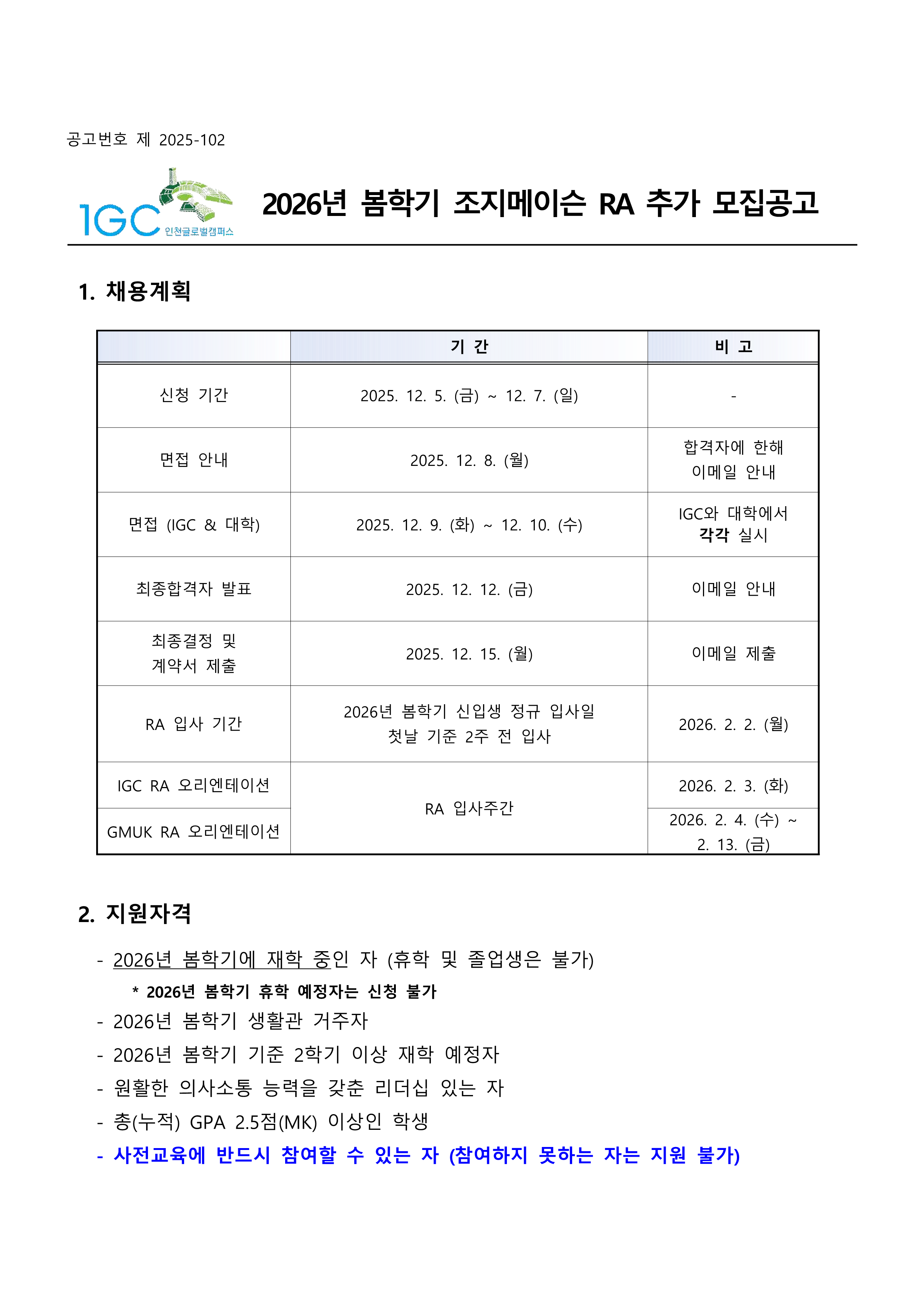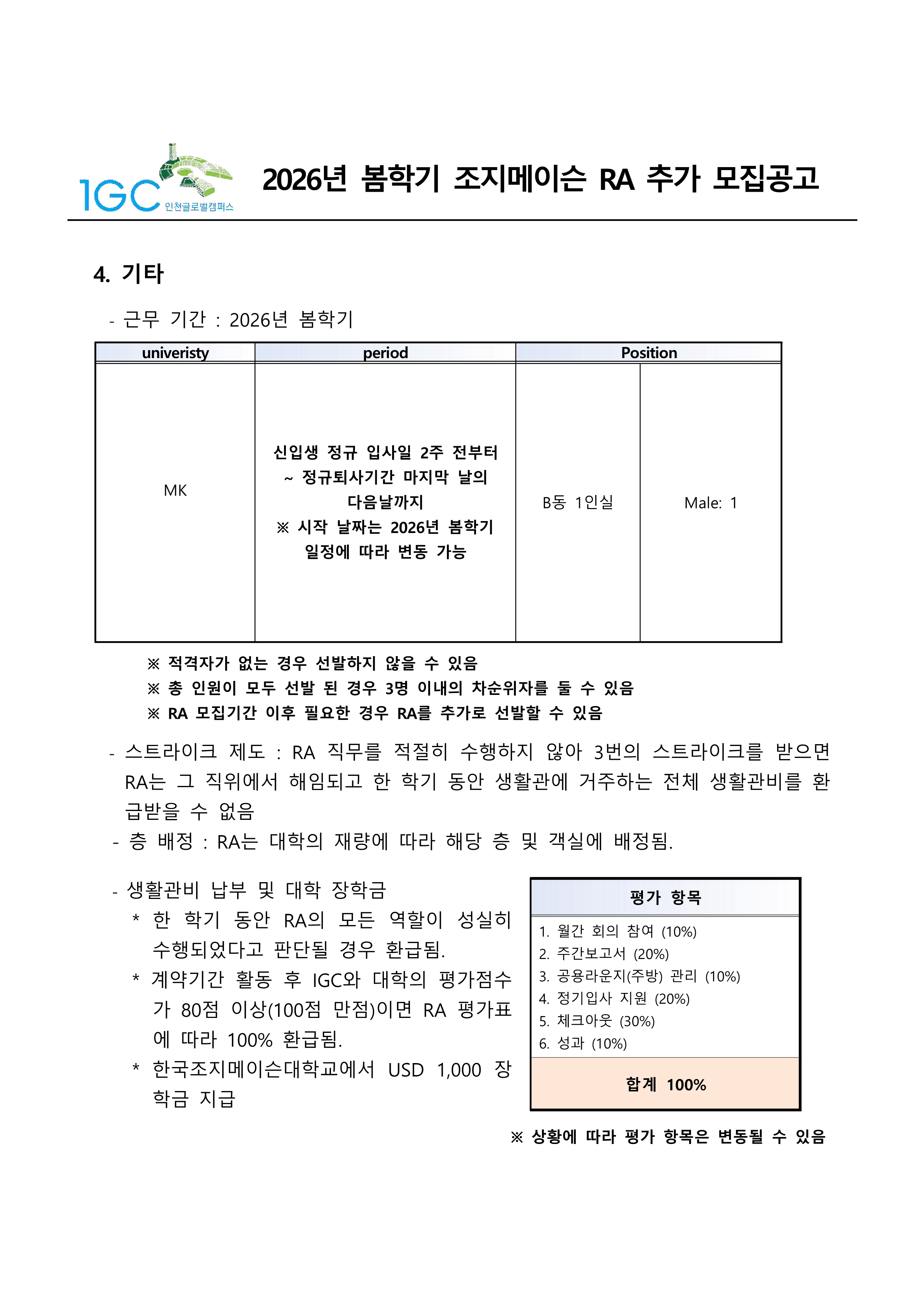 GMUK Additional Recruitment of 2026 Spring Semester RA (Single Male: 1)