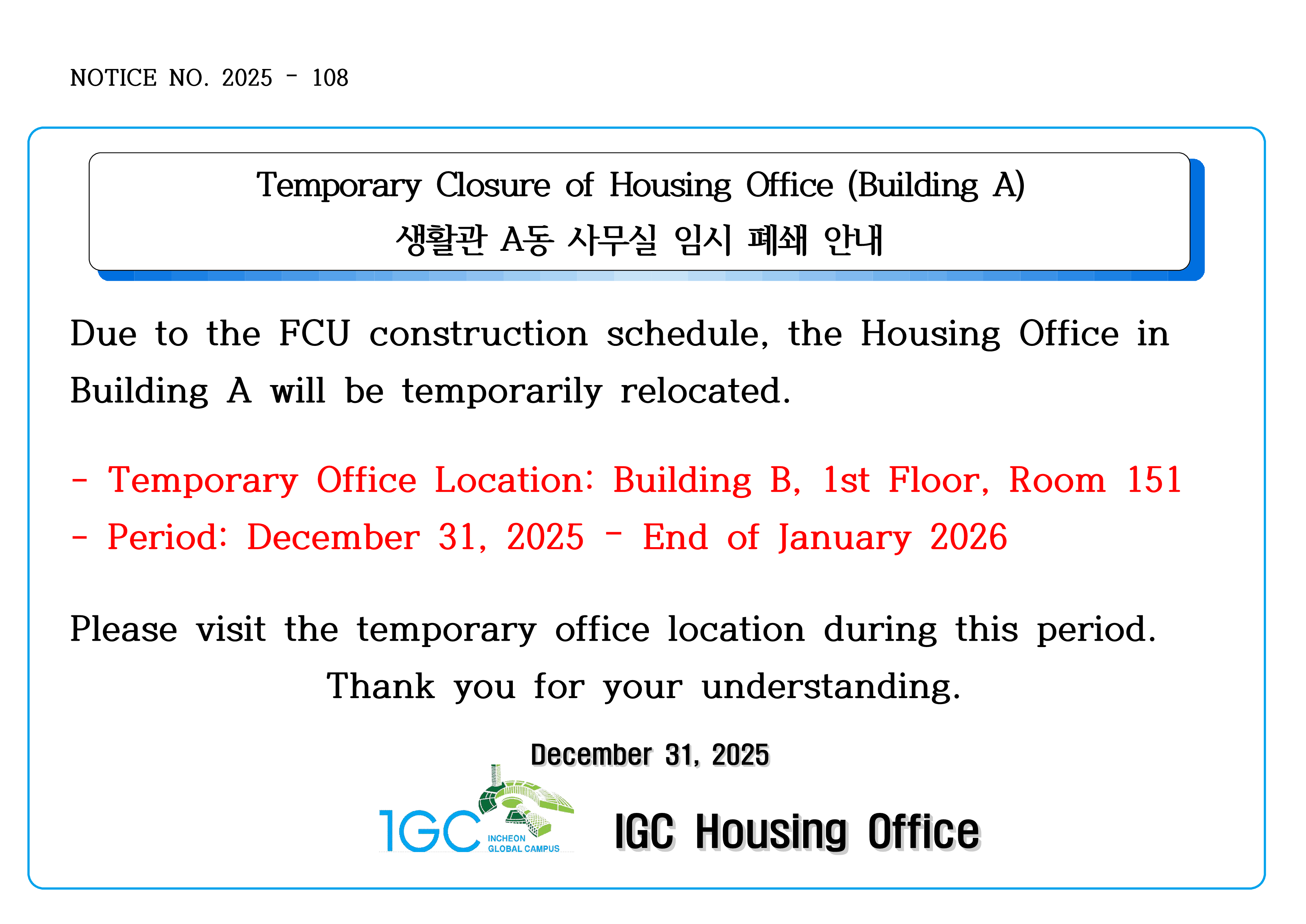 Temporary Closure of Housing Office (Building A)