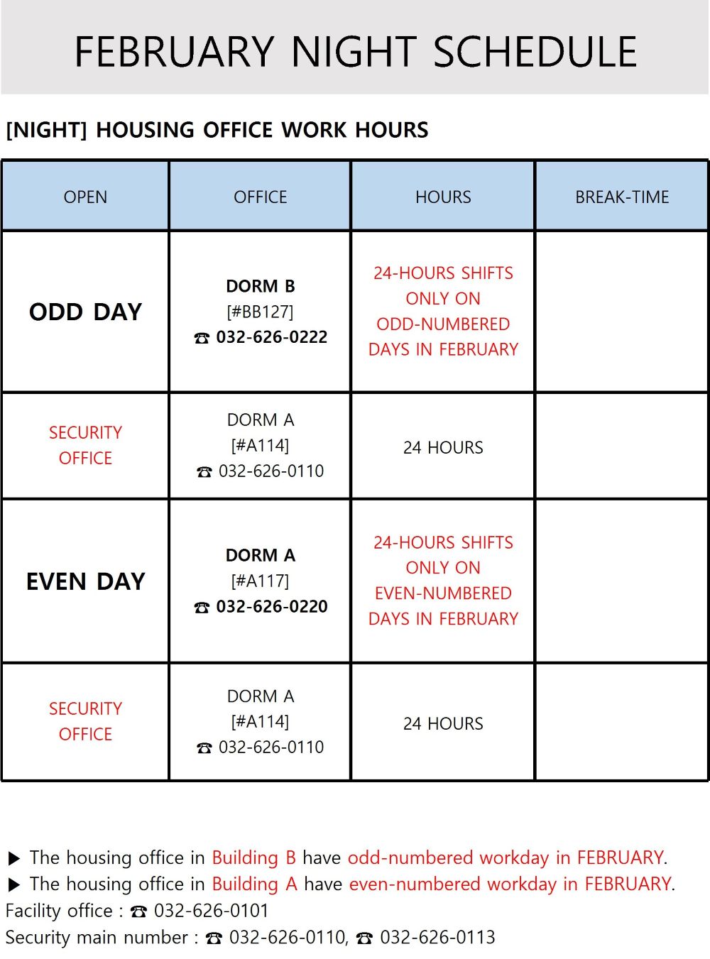 Nighttime housing staff Work Schedule in February