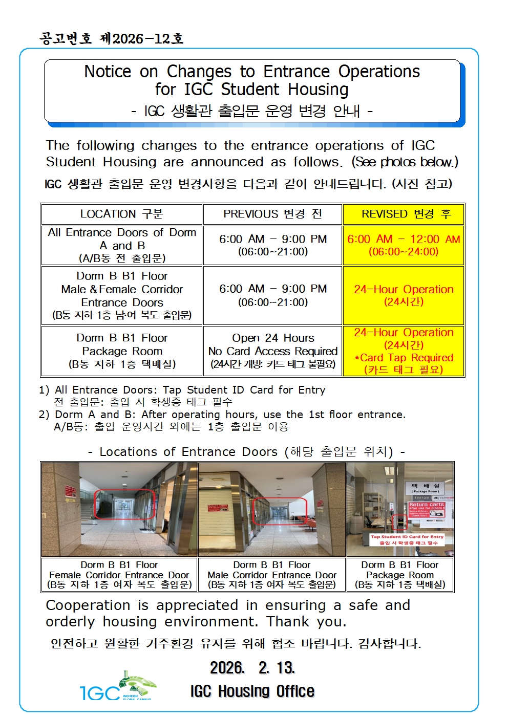 Notice on Changes to Entrance Operations for IGC Student Housing