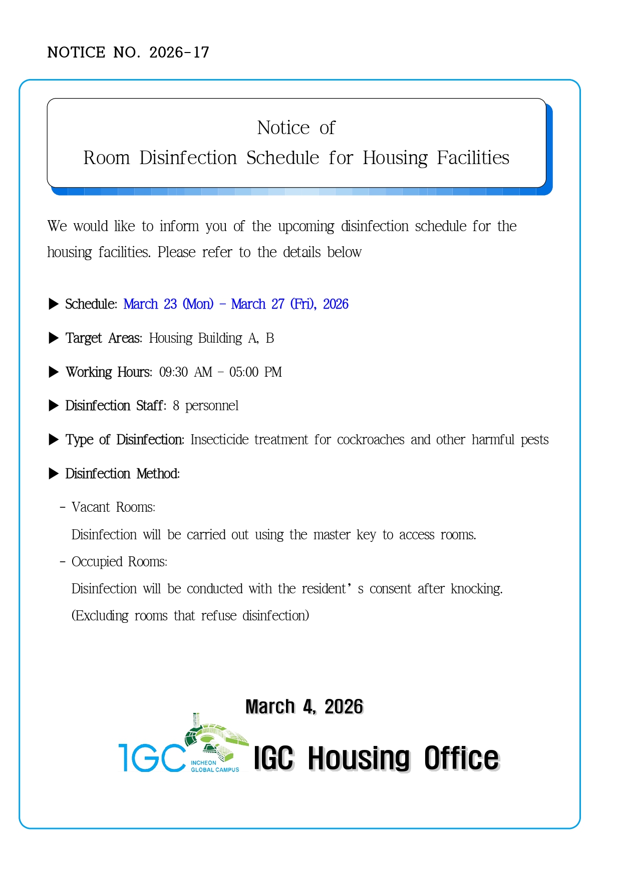 Notice of Room Disinfection Schedule for Housing Facilities