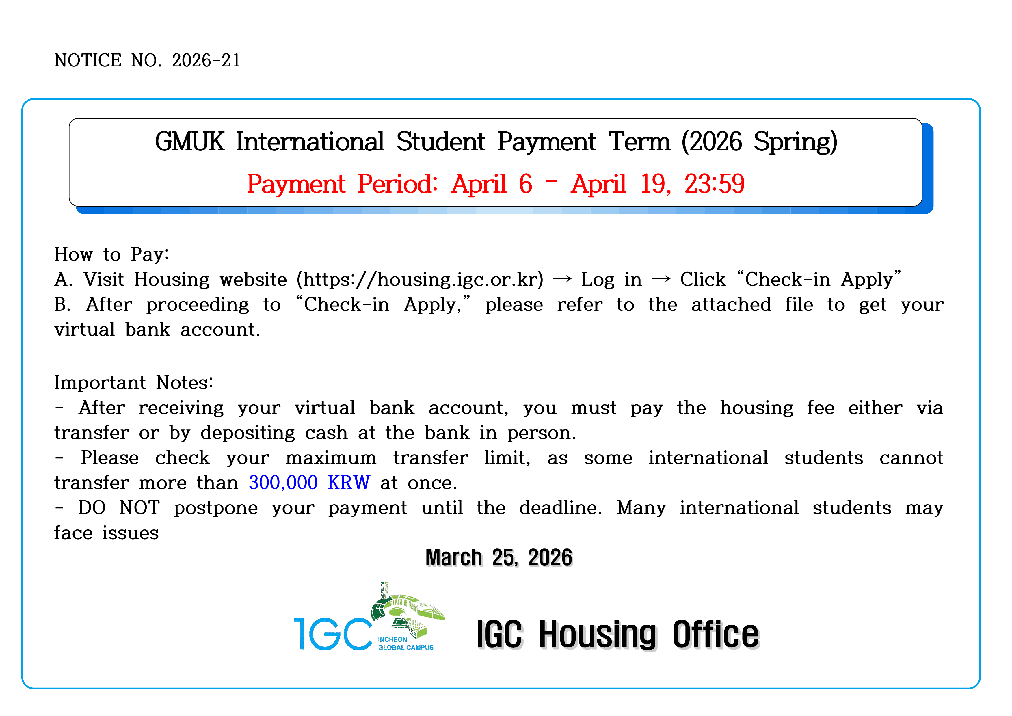 International Student Payment Term (2026 Spring)